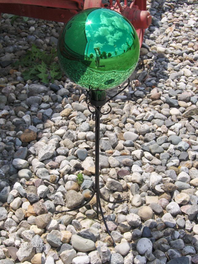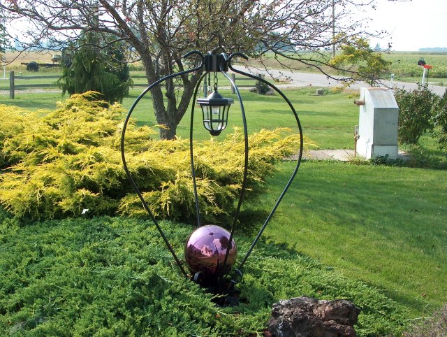 Enhance the beauty of your garden, walkway, or entryway with a large panoramic view from our 10" gazing ball. Crafted for an accent piece, or a stand alone lawn ornament. Nostalgic solar lantern provides a soft moonlight effect. No wiring needed. 46" H x 38" W. Item#3011